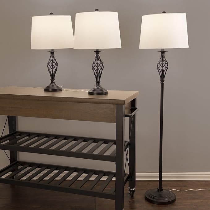 - STYLISH DESIGN - Each lamp body features an open spiral cage design in an oil-rubbed bronze metal finish. The silhouette will add a chic touch to any area of the home, and the included ivory shades are sure to complement a variety of room décor styles.