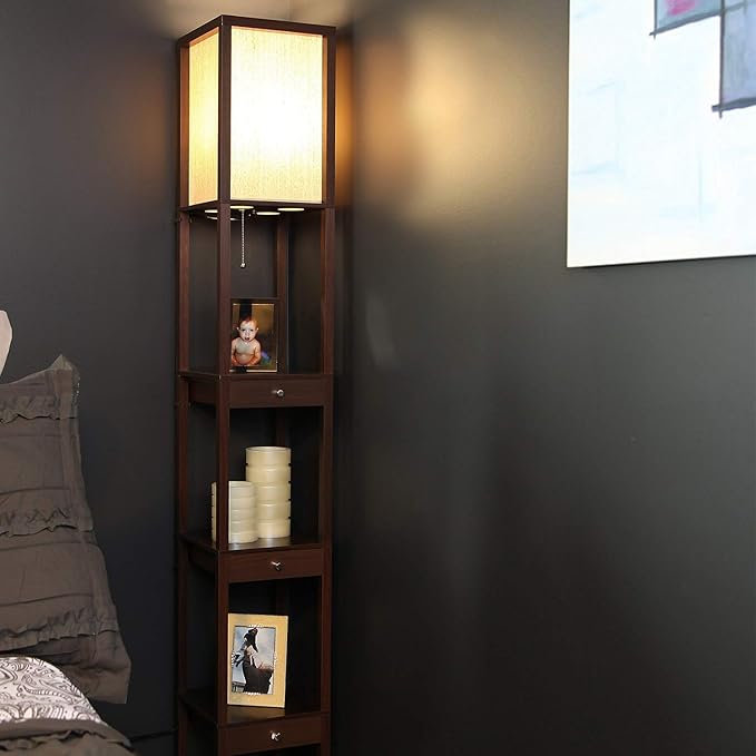 - Tower Floor Lamp with a Drawer & Book Shelf Combo: Brightech durable tall lamp has a stable structure and high loading that lends a soft ambient glow to contemporary spaces while providing a 4-tiered display shelving for added convenience. Have multiple drawers by the bed for convenient and discreet storage, while displaying books, art, and plants on the shelves. Enjoy the convenience of Brightech floor lamps in your bedroom, living room, guest room, foyer, or office.