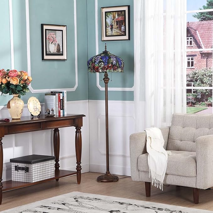 Bieye L10574 Wisteria and Rose Flower Tiffany Style Stained Glass Floor Lamp with 16 inch Wide Shade, 63 inch Tall