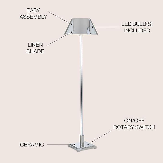 - Chromed lampshade and base in a classic floor lamp silhouette and scale