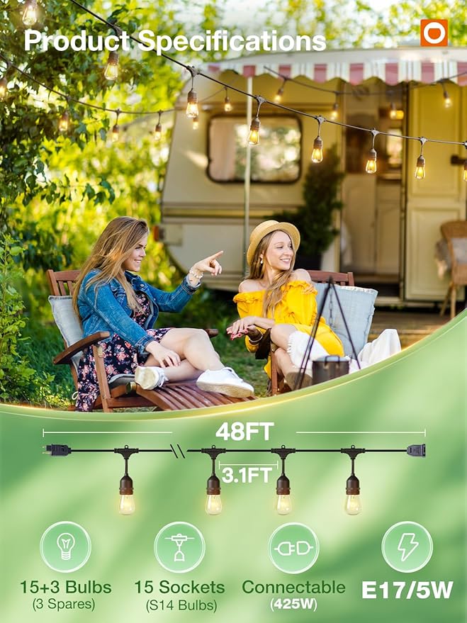 - [Including 1JCD-DL/E178 Edison Bulbs] Each strand contains 15 hanging sockets, provided with 18pcs 5W S14 incandescent glass bulbs. Compare it to the LED plastic bulbs, which is heavier but at the same time more translucent and heavy duty. The distance between bulbs is approximately 3.11FT. The maximum serial-connected power is 425W