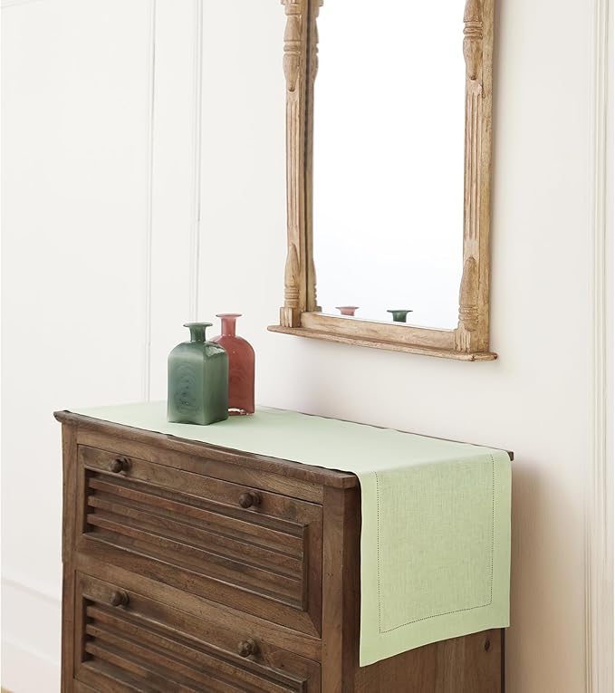 Solino Home Linen Table Runner 60 Inches - 100% Pure Linen Sage Green Hemstitch Table Runner 14 x 60 Inch Ideal for Dresser and Coffee Tables - Fall, Thanksgiving, Christmas - Classic Hemstitch