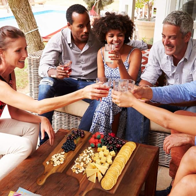 - Suitable Size: Acacia wood cutting board cheese board serving tray; measures 17 inches long with handle, 6 inches wide, 0.5 inches thick; ideal for serving bread, cheese, sandwiches, and party snacks at the table