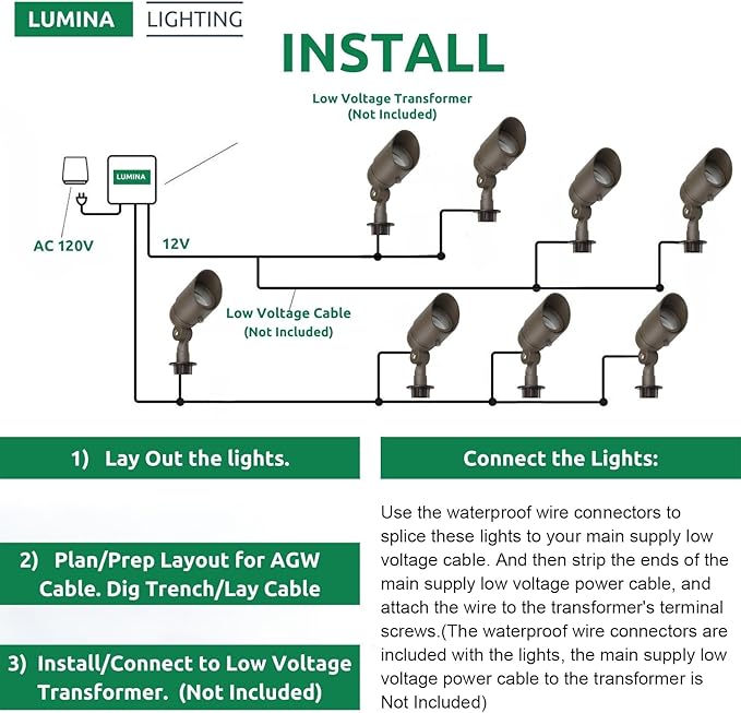 - 【Easy Installation】Just insert the (Light Ground Spike Stand) into the suitable position on ground, Then use Wire Connectors to Connect Landscape Lighting Fixtures. Light Fixture pre-wired with UL listed direct burial Wire/Cable. (Ready-To-Go SpotLights)