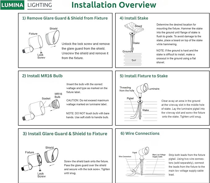 • 【Easy Installation】Just insert the (Light Ground Spike Stand) into the suitable position on ground, Then use Wire Connectors to Connect Landscape Lighting Fixtures. Light Fixture pre-wired with UL listed direct burial Wire/Cable. (Ready-To-Go SpotLights)