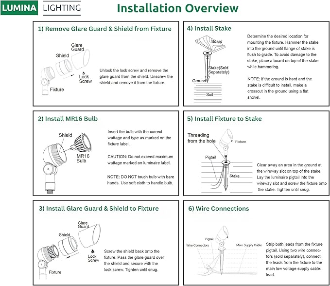 - 【Easy Installation】Just insert the (Light Ground Spike Stand) into the suitable position on ground, Then use Wire Connectors to Connect Landscape Lighting Fixtures. Light Fixture pre-wired with UL listed direct burial Wire/Cable. (Ready-To-Go SpotLights)