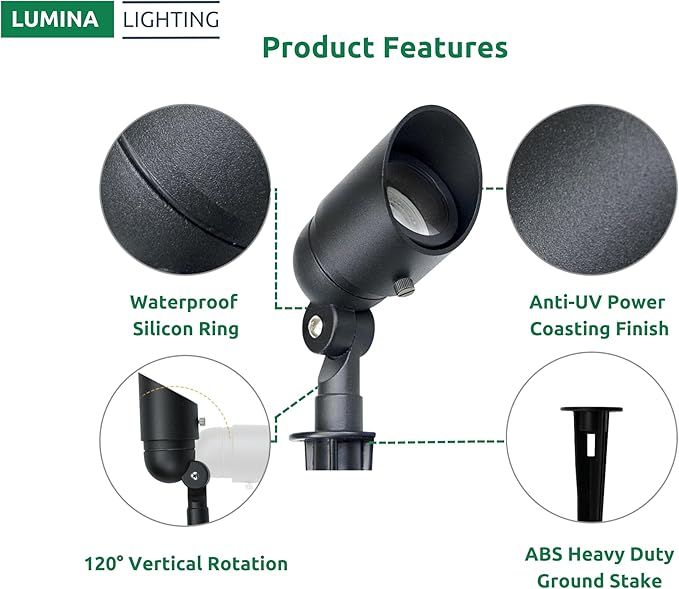 Lumina Lighting® 4W Landscape Lighting 12V Landscape Lights Low Voltage Landscape Spotlights Warm White Waterproof Outdoor Replaceable LED Bulb for Garden, Lawn, Porch, Patio and Yard (Black, 6-Pack)