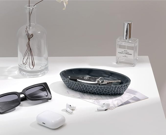 - Decorative Bowl: Classy color and honeycomb pattern, not only an organizer for jewelries and small items, but also a nice desktop decoration that easily matches with vanity countertop, linen closet, bedside table, toilet tank, wash basin, etc.