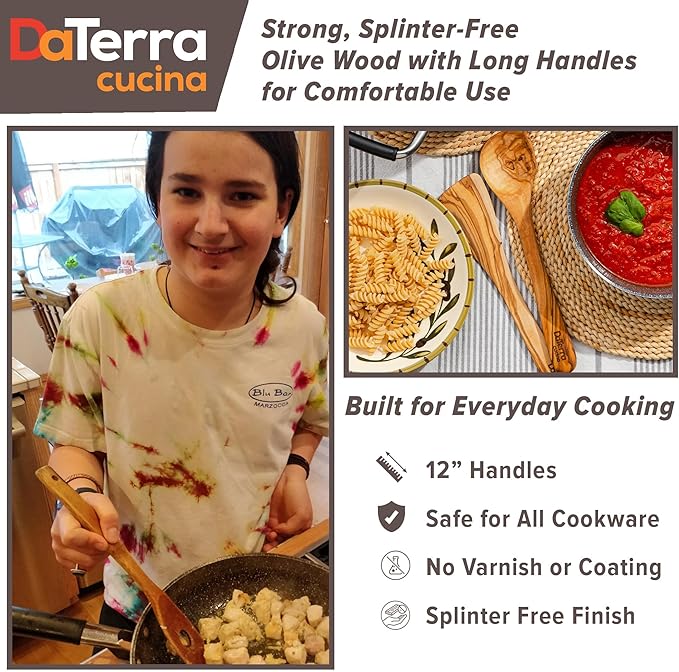 - PREMIUM MEDITERRANEAN OLIVE WOOD CONSTRUCTION: Crafted from 100% solid olive wood, each wooden kitchen utensil offers strength, balance, and rich earthy color. This is a long-lasting, splinter-free wood utensils set for cooking in any style of kitchen.