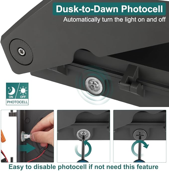 - [Dusk-to-Dawn Photocell] The built-in photocell automatically turns the light on at dusk and off at dawn. Make sure it’s in an area that receives daylight and not too close to reflective surfaces. If you prefer to use your own switch to control it, just unplug the photocell wire connector from inside.