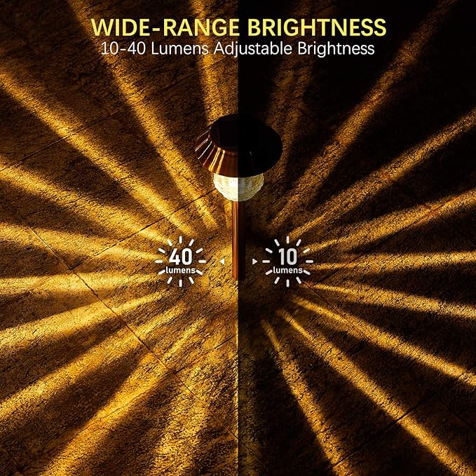 - Customize Modes & Long Lasting: Solar garden lights outdoor with optional modes to choose from 10 - 40 LM. Low Mode: 10 LM brightness is perfect for winter lasting up to 10 H. High Mode: 40 LM brightness is perfect for summer lasting up to 5 - 6 H.