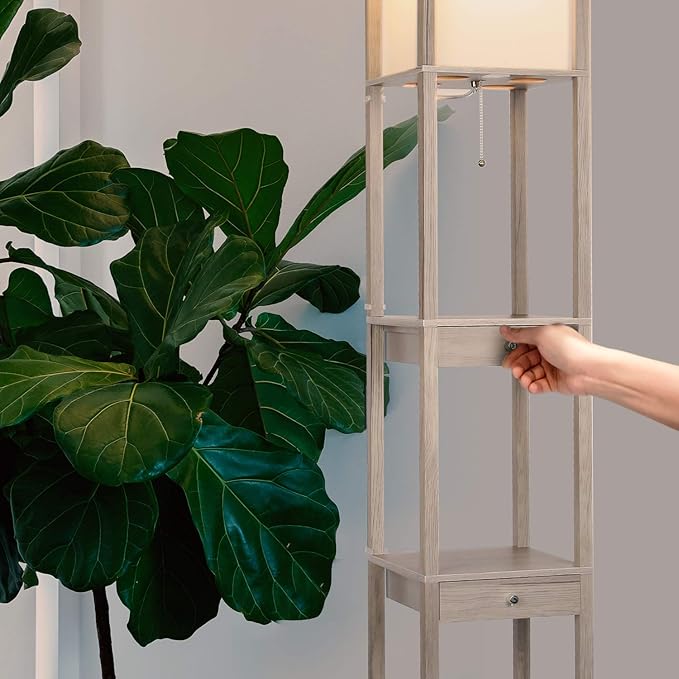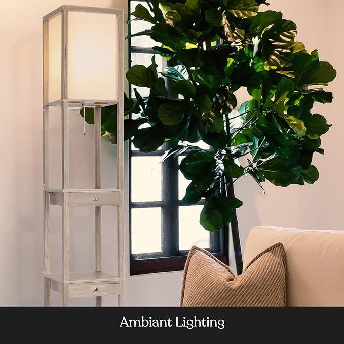 - Asian Style Living Room Decor: This Brightech modern shelf floor lamp with drawer is inspired by Japanese designs and comes in three colors. The off-white shade softens the brightness of the lamp and opens at the top filtering the light into a diffused glow. Create a cozy and comfortable atmosphere at night with this standing lamp.