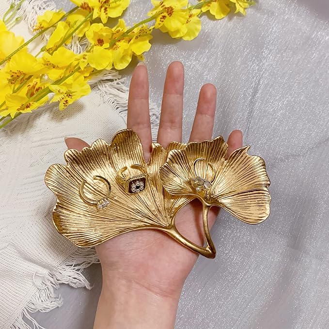 Metal Jewelry Dish, Small Leaf Shaped Ring Holder Jewelry Organizer, Trinket Dish Vanity Tray for Dresser Christmas Birthday Wedding Gifts 2-Tier Ginkgo-Gold