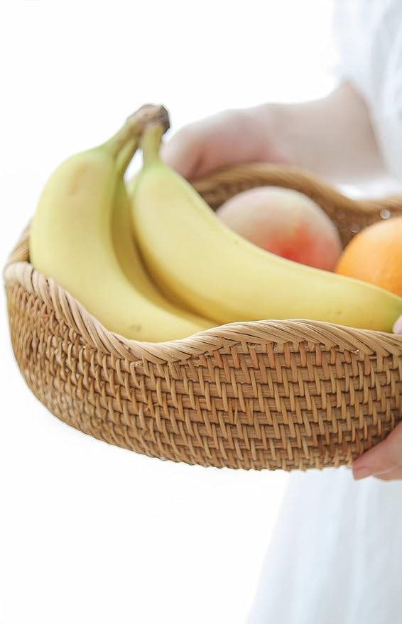 HITOMEN Handmade Rattan Bread Baskets Round Wicker Fruit Serving Storage Bowls, Natural Woven Decorative Kitchen Counter Organizing (Honey Brown) M-10.2"