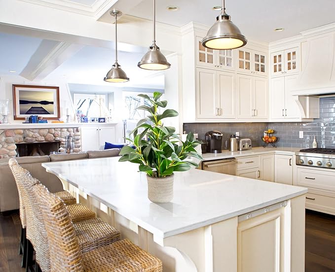 - 【Sturdy and good quality】The plant is pretty and the leaves texture feels rather real.It's pretty hard to tell that it's artificial without touching it.The vase it comes in is good quality cement pot in light grey color.With the rock decorative topping this houseplant is a nice complement to a shelf, end table, nightstand,bathroom counter, etc.