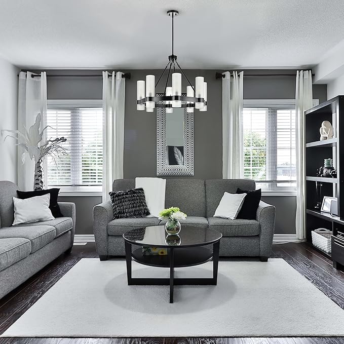 - COMPATIBLE WITH MOST STANDARD MEDIUM BASE BULBS - Black farmhouse chandeliers for dining room comes with 8 frosted glass cylinder shade covers and with a preassembled steel round metal frame