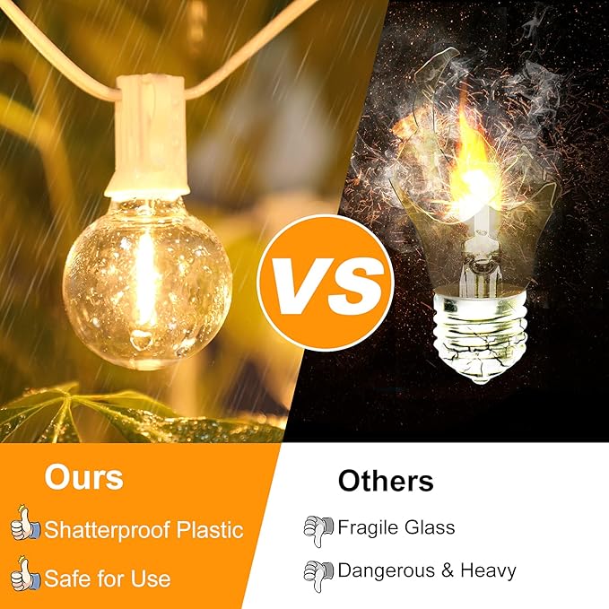 - 【Waterproof & Shatterproof, Safe For Use】With fully sealed and waterproof design socket, The outdoor string lights can stay under the sun, rain, even in the worst weather conditions. Unlike other string lights that made by glass which easy to crack and heavy, the bulbs of our 100ft G40 outdoor backyard lights are made by plastic. It won’t be easily broken while dropping down or blow away by the wind, much safer for using, keep you away from dangerous shards