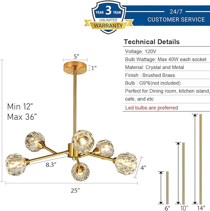- HEIGHT ADJUSTABLE:The package of the gold sputnik chandeliers contains 3 different sizes of hanging rods (6 inches;10 inches;14 inches);you can assemble the hanging rods according to the height you need to install,perfect fit for your ceiling
