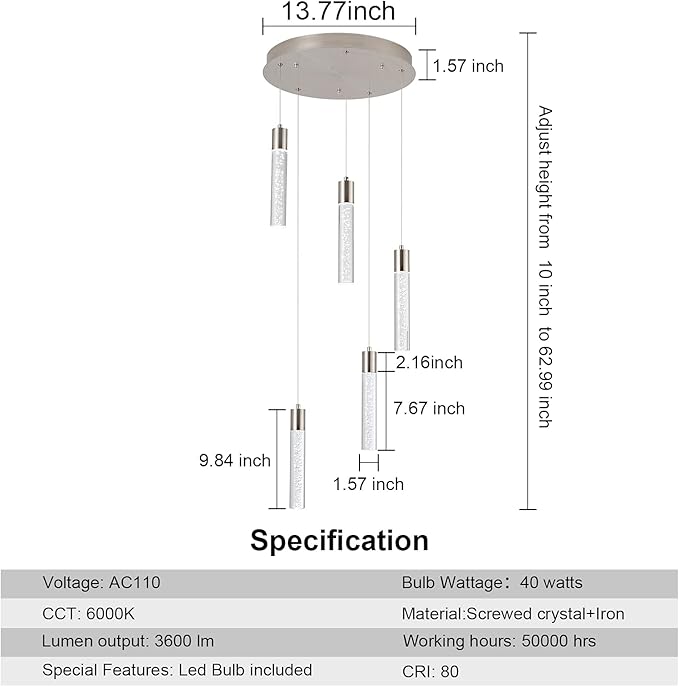 - ✔ HIGH PERFORMANCE - This 5-light pendant lights has premium Screwed Crystal bubble with a Brushed Nickel finish, CRI 80+, 40W, 3600 Lumens. kitchen pendant lighting has 6000K LED chips. No need buy led bulbs.