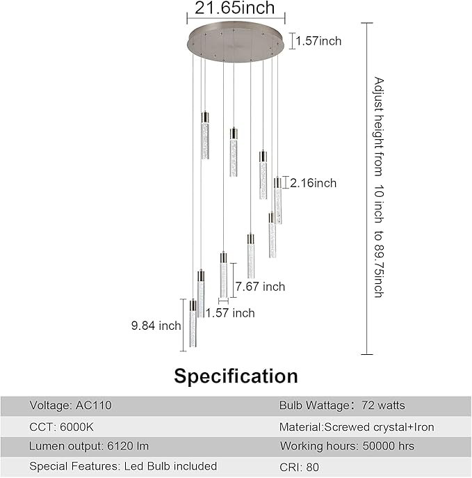 - ✔ HIGH PERFORMANCE - This 9-light Crystal chandelier light fixture has premium Screwed Crystal bubble with a Brushed Nickel finish, CRI 80+, 72W, 6120 Lumens. High Ceiling Chandelier has 6000K LED chips. No need buy led bulbs.