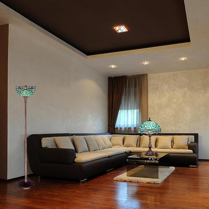 Tiffany Floor Lamp Torchiere Stained Glass Torch Lamp 12X12X67 Inch Antique Standing Corner Light (Green Dragonfly)