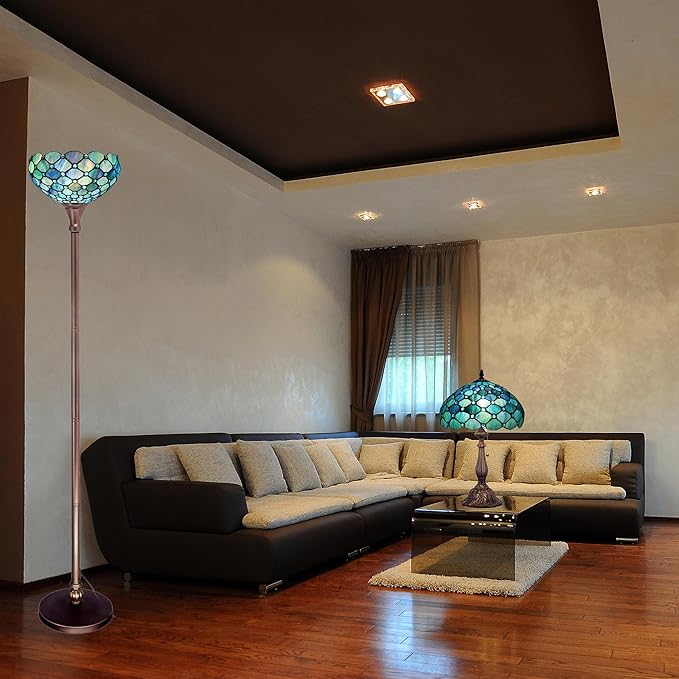 Tiffany Floor Lamp Torchiere Stained Glass Torch Lamp 12X12X67 Inch Antique Standing Corner Light (Sea Blue Pearl)