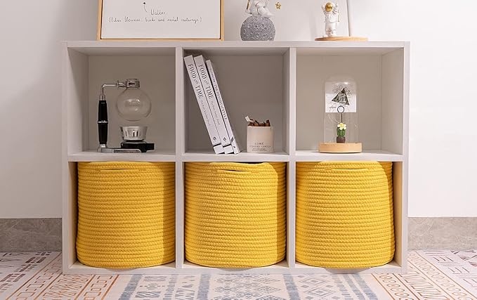 voten Round Storage Cubes Baskets Bins Organizer 11x11x11'' Fit 12x12'' Cube Storage Organizer Bookcases Shelf, Durable Woven Cotton Rope Basket, 3Pack Yellow