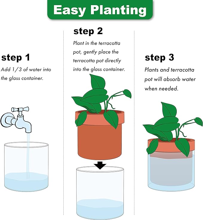 - Self-Watering System: The bottom quarter of the terracotta pot is unglazed, allowing plants to absorb water through the pot walls.