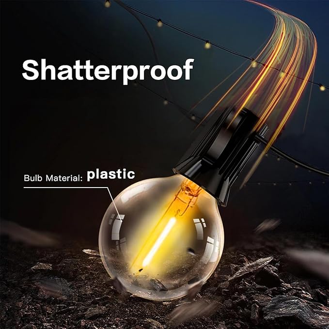 - 💡[ Shatterproof & Waterproof ] Outdoor string lights with 24 clear G40 Bulbs, and extra 2 spare bulbs, end-to-end connectable. 2 feet spacing between bulbs, UL-listed patio string lights are built with weatherproof technology, which can withstand extreme temperatures, sun, rainy, windy, snow, or damp climates. You can confidently leave these ultra-durable string lights on display year-round.