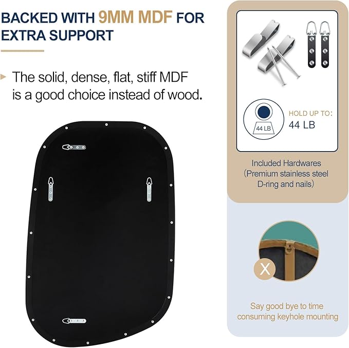 - Easy-Hang & Safe Delivery: This unique bathroom mirror features triple-layer protection—PE bag, poly foam, and sturdy master box—to ensure secure delivery. The asymmetrical mirror includes four reinforced D-ring hanging clips, enabling straightforward horizontal or vertical installation with included hardware