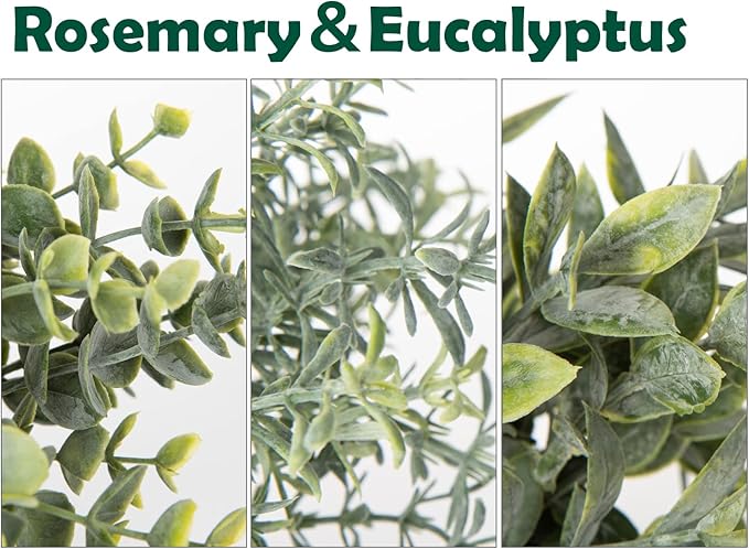 - Material - These 3 fake potted plants with fake plants are made of high quality PE plastic. Roots and branches have clear veins and the natural color gradient catches the eye at first glance.This set of Mini Potted Greenery features eucalyptus, boxwood and rosemary in assorted green tones, potted plant small perfect for creating a comfortable atmosphere you can enjoy for the years to come.