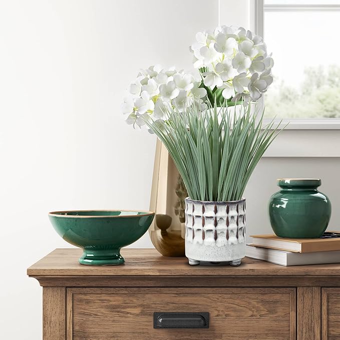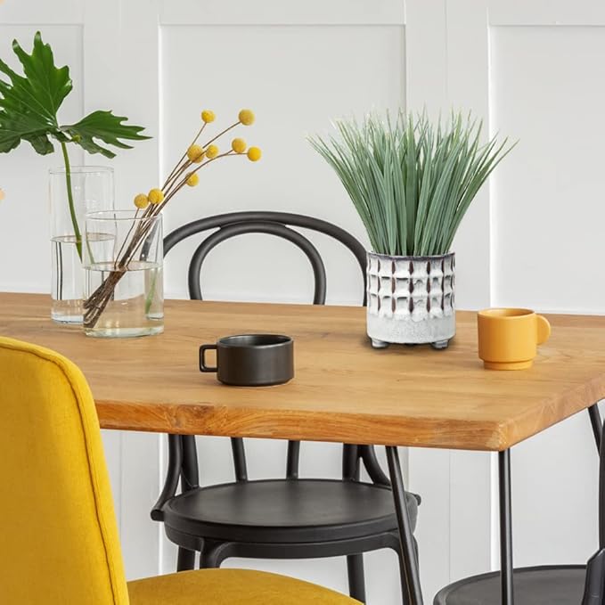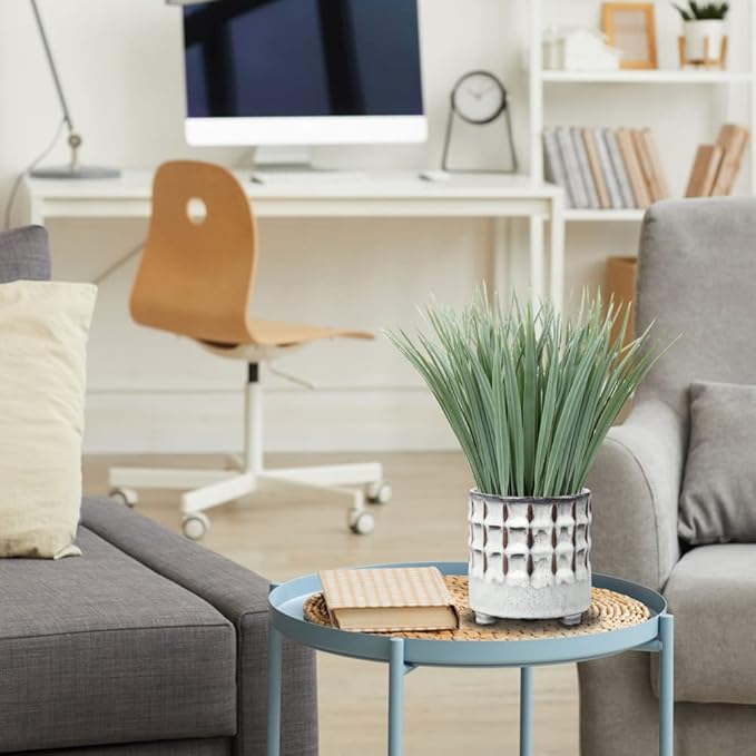 - 【HANDMADE BOHO PLANTER】Artificial grass ceramic pots use a superior electroplating process and fire at high temperature, it glazed 3D grid pattern, and a grey color finish. Total length approx 9.5", ceramic pot: 3.9"wx3.54"h with 3 stubby feet. Artificial plants pot are made by hand, please note that the colors of each are slightly different.
