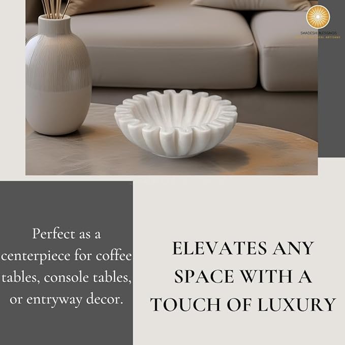 SWADESHI BLESSINGS HandCrafted Marble Ruffle Bowl/Antique Scallop Bowl/Fruit Bowl/Vintage Ring Dish/Decorative Flower Dish/HouseWarming Gift/Wedding Gifts/Urli (6 Inches)