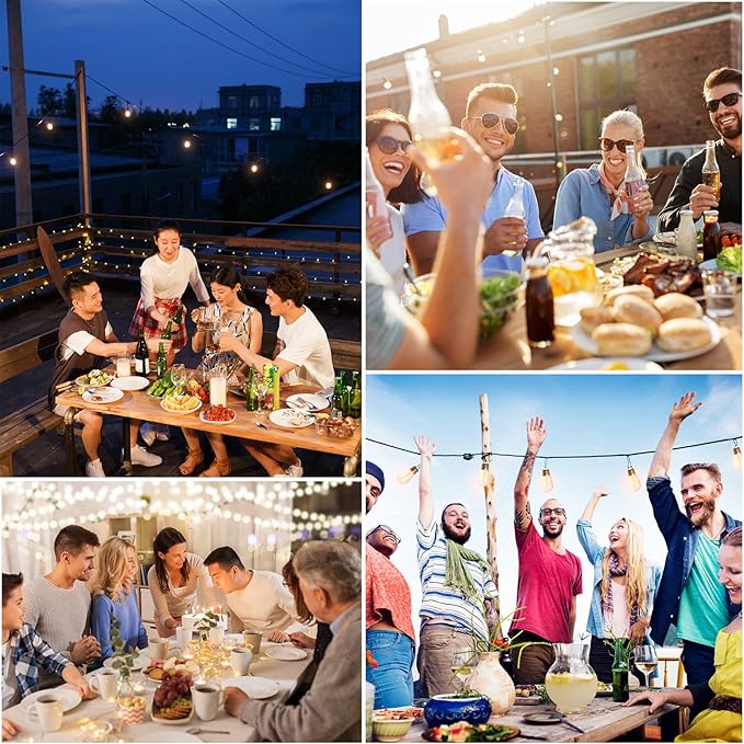 - 【Romantic Decorative Party Lights】 The Solar Patio String lights are visually very beautiful. The warm light of the bulbs creates a calm and dreamy atmosphere. The outdoor string lights for patio can provide a relaxed and lively environment for your garden, patio, balcony, bedroom, pergola, cafe, birthday party, family gathering, evening cocktail party, or wedding reception and add more entertainment atmosphere.