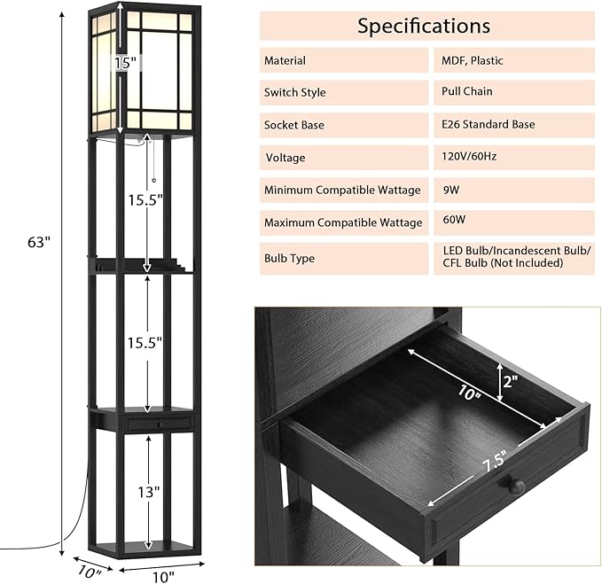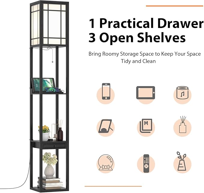 - Ample Storage Space: Equipped with 1 practical drawer with convenient handle and 3 open shelves, this standing floor lamp brings roomy storage to accommodate different items, such as remote control, photo frames and magazines, keeping your space tidy and clean. Besides, the wire storage clamp reduces clutter as well.