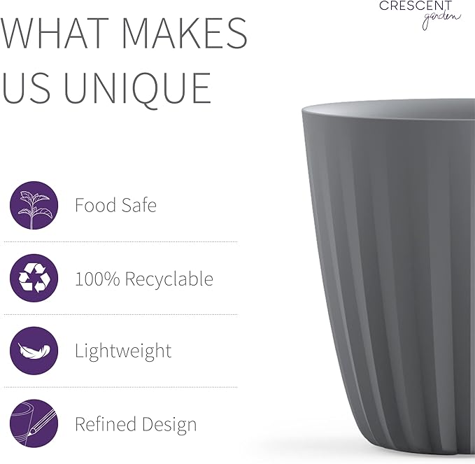 - RECYCLABLE: Crescent Garden's eco-friendly planters are made from 100% recyclable high-grade polyethylene. Being lightweight makes them easy to place anywhere indoors or outdoors but also means we use less packaging and energy for transportation.