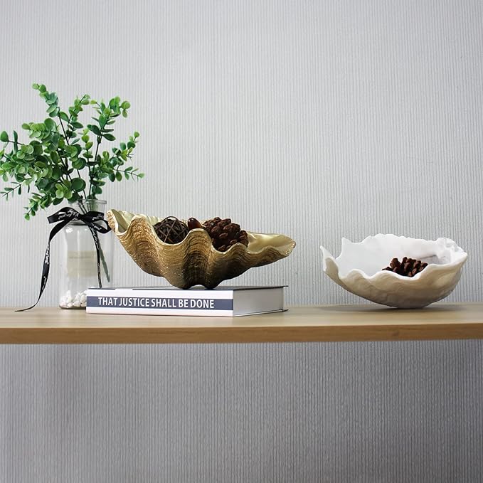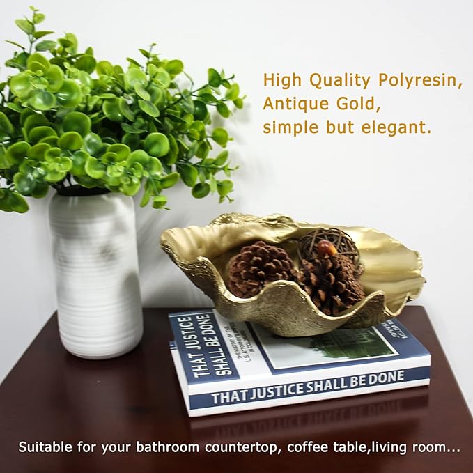 - Great for any bathroom countertop or living room side table, this plaster bowl is inspired by an opening clam, with antique gold colour to bring an elegant feel to your living room, dinning table, home or office.