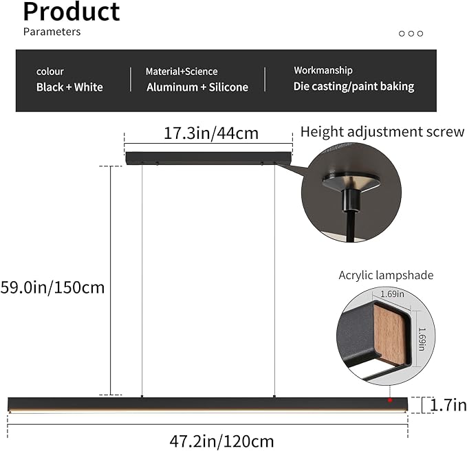 - Parameters :Dimmable LED pendant lights kitchen island - color: black, size: 47"(L)*2.1"(W)*2.1"(H), color temperature: warm white 3000k/natural white 4000K/cool white 6000K, CRI 85+, Voltage: 100-240V, lifespan:50000H, hanging installation.
