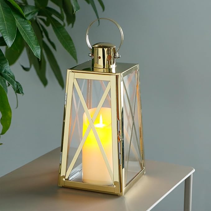 TRIROCKS Stainless Steel Decorative Lantern 12''H Metal Outdoor Candle Holder Hanging Candle Lantern with Tempered Glass for Christmas Home Wedding Living Room Parties Indoor Outdoor(Gold Trapezoid)