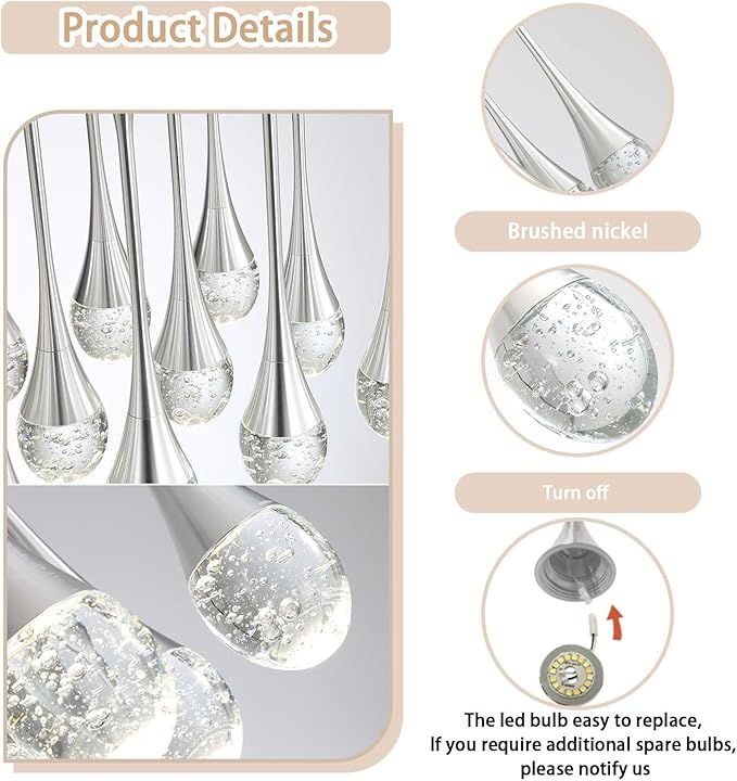 - 【Crystal Raindrop Chandelier Design】 : Absolutely beautiful,elegant style K9 bubble crystal and hardware pendant light.In addition to its beautiful shape,it is suitable for entryways,staircases,hallways, foyers,hotels,and apartments.