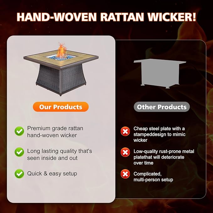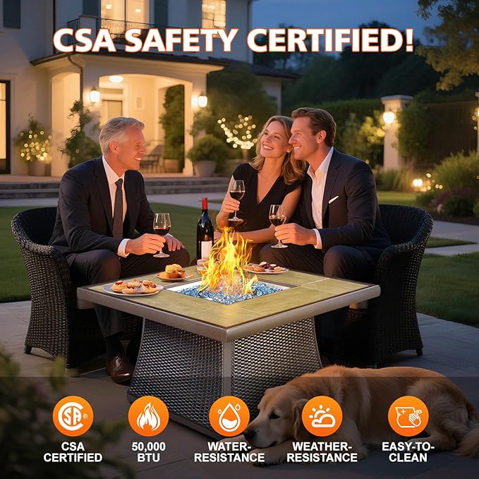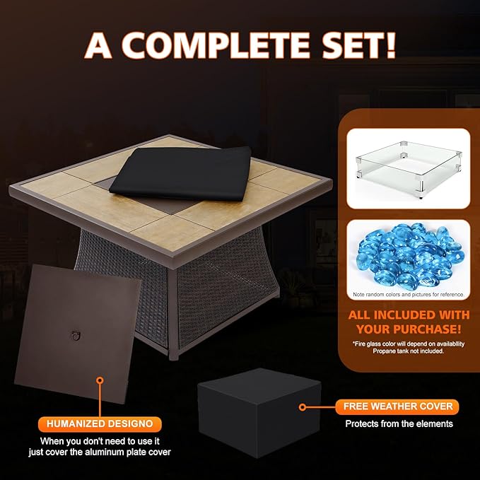 - 【Durable High-Quality Materials】The gas fire pit table are handwoven from synthetic resin, effectively reducing fading and extending outdoor lifespan. The extra-large fire pit features a stone tile tabletop, while the fire pit frame is made of powder-coated aluminum, ensuring durability, rust resistance, heat resistance, and fade resistance. The combination of these two materials creates a beautiful and elegant appearance, perfect for your balcony or backyard