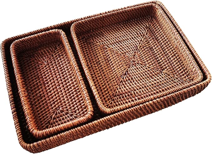 - It is a set of 3 rattan handwoven tray; Dimensions: Large: L365mm * W230mm * H60mm / 14.4inches(L) * 9inches(W)*2.4inches(H); Medium: L210mm * W210mm * H45mm / 8.3inches(L) * 8.3inches(W)*1.8inches(H);Small: L110mm * W210mm * H40mm / 4.3inches(L) * 8.3inches(W)*1.7inches(H), stackable for easy to storage.