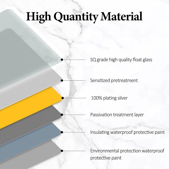 - 【Super Cost-effective】Our wall-mounted bathroom frameless mirrors have high-definition polished mirror reflection without any visual distortion. 5mm high-definition environmental protection copper-free silver mirror design, natural and soft light, safe, waterproof and explosion-proof. Silver backing on glass prevents corrosion in high humidity environments, and you don't have to worry about it in wet bathrooms. And easy to clean, just use a dry cloth.