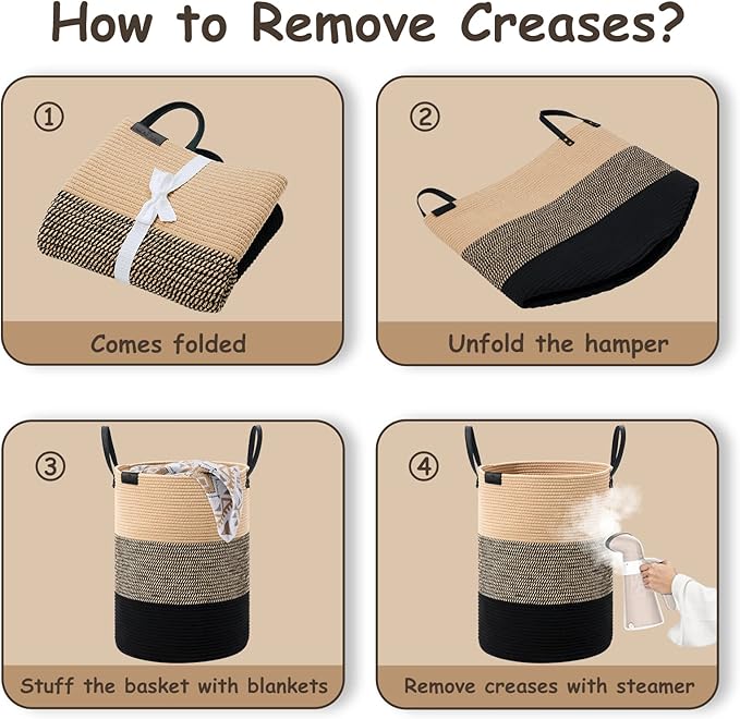 - ❤【WAY TO RESTORE ELEGANT SHAPE】 Our collapsible baskets are folded during shipping. Please fill the hamper with clothes or blankets for a period of time. If you want to remove creases from the surface of the tall basket, you can use a steamer.