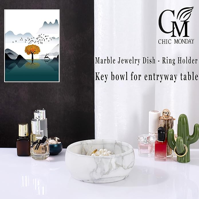 - 【Natural Material Marble Jewelry Tray】 Our ring holder decorative bowl is made of superior Marble. The color and texture of each bowl is different, distinct and natural. Treat your accessories with this beautiful real marble decorative bowl on your dresser, vanity or bathroom shelf and never worry about finding your accessories again!
