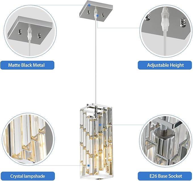 Chrome Pendant Lighting Modern Pendant Light, Mini Crystal Chandeliers,Adjustable Pendant Light Fixture for Kitchen Island Dinning Room Bedroom (1 Pack)