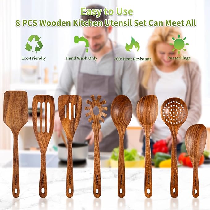 Wooden Spoons for Cooking, 8 PCS WOSPONFAN Kitchen Utensils Set, Wooden Utensils for Cooking - Wooden Spoons, Spatula Set, Slotted Spoon, Handmade Acacia Wooden Spoon Set