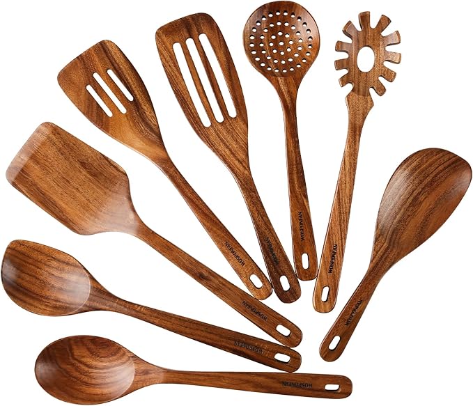 - NATURAL TEAK WOOD: Crafted from solid teak wood, our utensil set is 100% handmade and eco-friendly. It's durable and crack-free, unlike silicone or bamboo alternatives. Note: Natural wood utensils may have slight color variations.