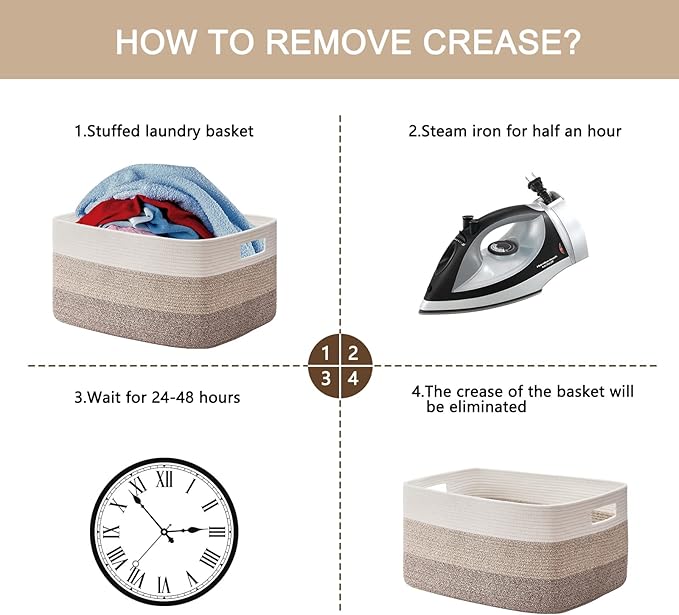 - Washable Large Basket: This large basket can be washed by hand or machine with gentle detergent. If machine washed, please put them into a laundry bag. NOTE: These cotton rope baskets are folded when shipping, but it will turn back to its elegant shape quickly if you fill it with some towels or clothing, and iron is great idea to remove the creases