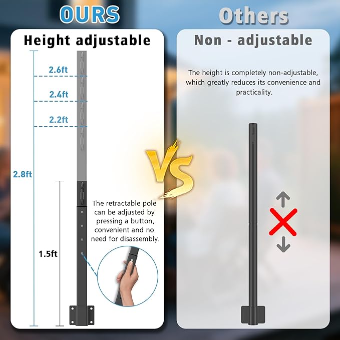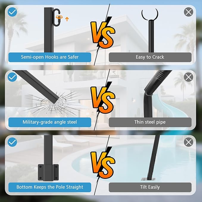 - No height restrictions:Made of high quality metal, it will not bend or wobble. The poles for string lights is not limited by its own length, and the excellent load-bearing properties allow you to install it on high fences and walls. Get rid of the general height limitation. You can also hang more number of strings of lights. Also can be applied to banners, lanterns, wind chimes, all kinds of light decoration, etc.
